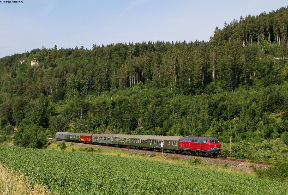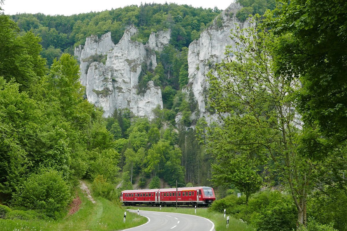 Groß das Tal, klein der Zug. Auf der Fahrt von Triberg nach Ulm hat am 31.05.2019 RE 22313 kurz zuvor das im Oberen Donautal liegende Neidingen passiert.