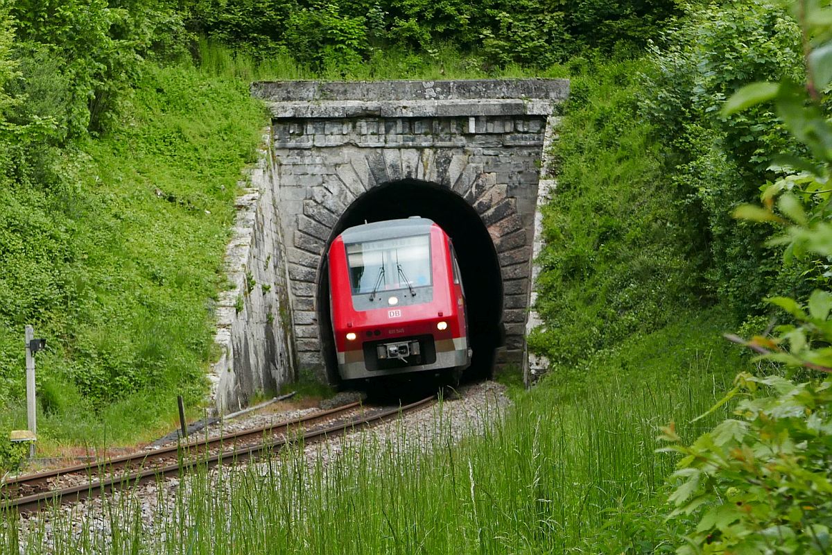 611 545, am 31.05.2019 unterwegs als RE 22309, Fridingen - Ulm, hat den 95 m langen Schlossberg-Tunnel in Scheer fast durchquert.