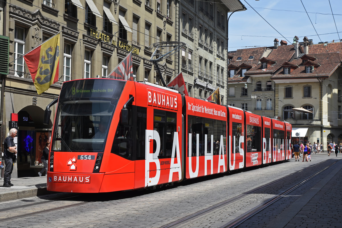 Be 6/8 Combino 654 mit der Bauhaus Werbung, auf der Linie 8, bedient die Haltestelle Bärenplatz. Die Aufnahme stammt vom 25.06.2019.