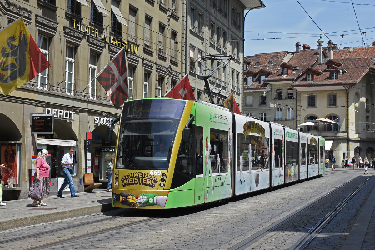 Be 6/8 Combino 669 mit der Werbung für die Lindenhofgruppe, gratuliert dem SC Bern für den Schweizermeistertitel im Eishockey. Hier fährt der Combino auf der Linie 8 bei der Haltestelle Bärenplatz ein. Die Aufnahme stammt vom 25.06.2019.