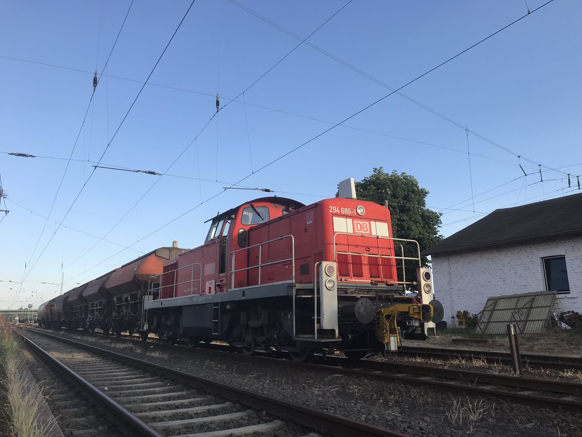 Die 293 511-2 (92 80 1293 511-2 D-LDS) des Eutiner Eisenbahnunternehmen LDS GmbH (LDS steht für Logistik, Dienstleistungen und Service) steht am 07.07.2019 mit dem Drehhobel D-HOB 4.0 (D-HOB 2500) der Schweerbau beim ICE-Bahnhof Montabaur. Die Einheit Drehhobel D-HOB 2500 IV (D-HOB 4.0) besteht aus dem Steuerwagen (Schweres Nebenfahrzeug-Nr. D-SBAU 99 80 9580 003-8) einem ursprünglichen GAF 100 R welches keinen eigenen Antrieb mehr hat, dem Technologieträger D-HOB 2500 IV bzw. D-HOB 4.0 (Drehhobel) Schweres Nebenfahrzeug-Nr. D-SBAU 99 80 9427 020-9) und dem Spänetransportwagen STW 01 Schweres Nebenfahrzeug-Nr. D-SBAU 99 80 9552 100-6. Zudem war noch der Flachwagen 27 80 3302 030-8 D-WSG der Gattung Ks mit aufgesetzten Werkstatt- und Aufenthaltscontainer dort abgestellt. Die Lok ist eine nach dem Umbaukonzept Baureihe 293 von ADtranz remotorisierte und modernisierte DR V 100 (Spenderfahrzeug ist nicht bekannt), sie wurde 2000 unter der Fabriknummer 72350 umgebaut. Seit 2003 ist sie bei der LDS. Umbaukonzept Baureihe 293 ADtranz modernisierte zwischen 1995 und 2002 59 Loks zur Baureihe 293. Neben der Aufarbeitung der vorhandenen Aggregate erhielten auch diese Lokomotiven neue Motoren von Caterpillar oder MTU. Die Druckluftanlage wurde erneuert, ebenso die elektrische Steuerung. Neu war auch die hydraulisch angetriebene Kühlanlage. Bei mehreren der Loks mussten neue Betriebsbücher angelegt werden, da die Ursprungslokomotive nicht feststellbar war. Zwei weitere Lokomotiven wurden durch verschiedene Werkstätten nach diesem Konzept umgebaut. TECHNISCHE DATEN:: Achsanordnung: B'B' Spurweite: 1.435 mm Länge über Puffer: 14.350 mm Drehzapfenabstand: 7.000 mm Gesamtachsstand: 9.300 mm Höchstgeschwindigkeit 100 km/h Motor: 12-Zylinder-4-takt-Dieselmotor mit Turbolader und Ladeluftkühlung Leistung: 1050 kW / 1428 PS Gewicht der Lok: 72 t