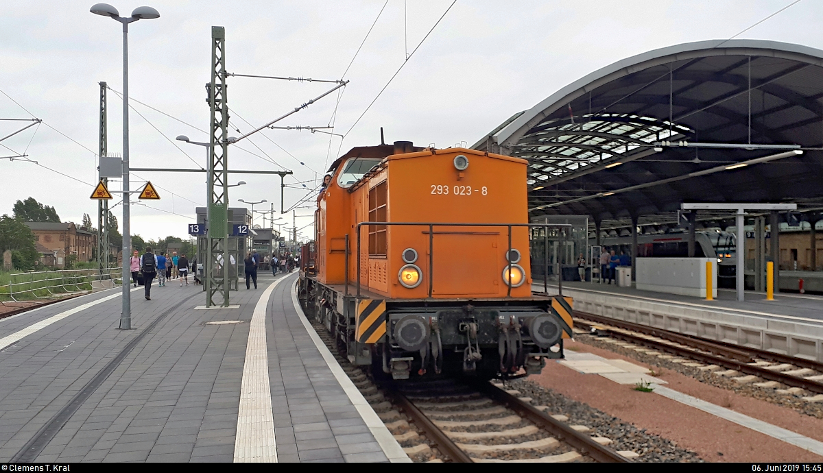 Verkehrte Welt in Halle(Saale)Hbf II: Speziell für den Güterverkehr stehen östlich des Hauptbahnhofs zahlreiche Gleise zur Umfahrung der Bahnsteige zur Verfügung. Derzeit ist aufgrund von Bauarbeiten fast nur die Hälfte aller Bahnsteiggleise nutzbar, sodass meist kein Stück Schiene freibleibt. Teilweise gibt es Doppelbelegungen. Nicht so an diesem Nachmittag, als ein Flachwagenzug mit 293 023-8 (DR V 100.4) der Eisenbahn-Bau- und Betriebsgesellschaft Pressnitztalbahn mbH, der den Hauptbahnhof auf Gleis 12 in nördlicher Richtung durchfährt, den leider nur sein Smartphone mitführenden Fotografen überraschte. Grüße zurück an den Tf! Um diese Zeit hätte dort der RE 75716 (RE4) nach Goslar gestanden. Dieser wurde kurzerhand auf Gleis 9 (Fernbahnsteig) geleitet. Wenig später fuhr hier ein ICE 1 ein, für den der Bahnsteig beinahe zu kurz gewesen wäre. [6.6.2019 | 15:45 Uhr]