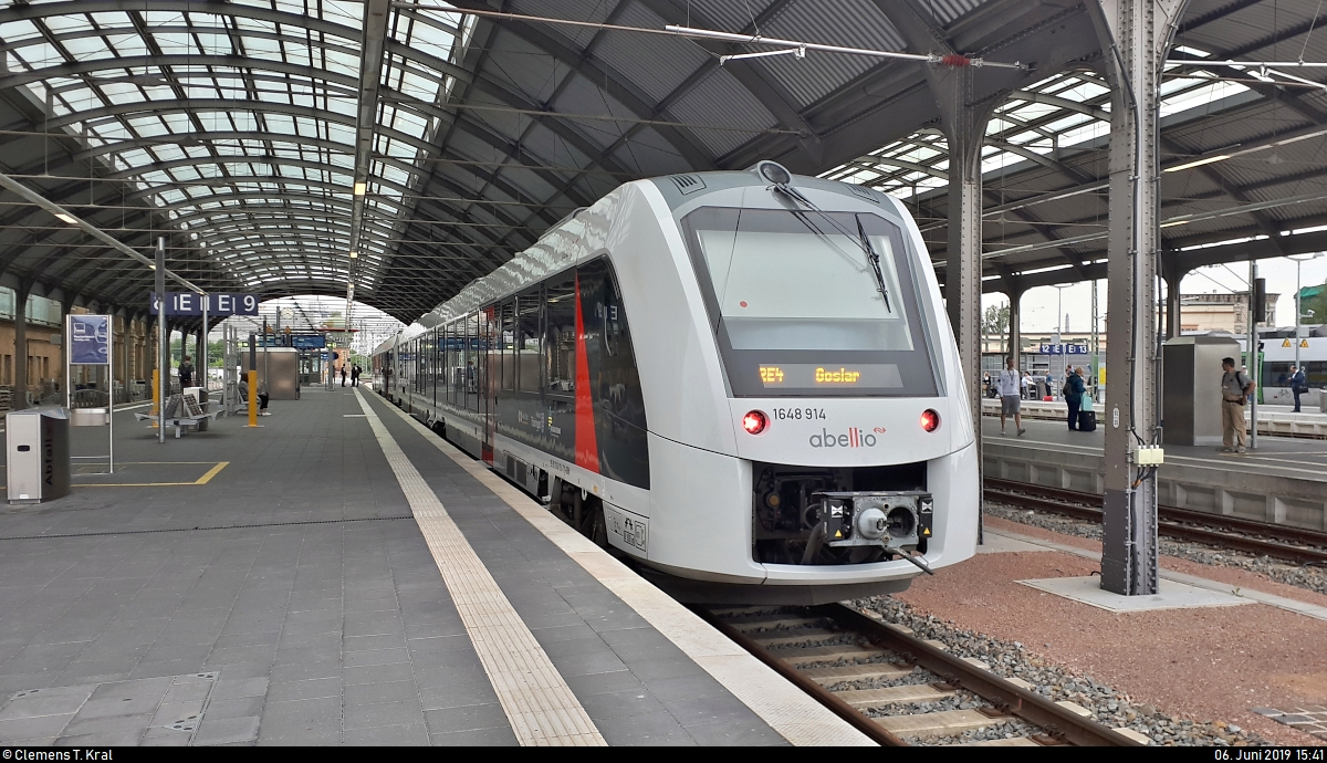 Verkehrte Welt in Halle(Saale)Hbf I: Smartphone-Aufnahme von 1648 914 und 1648 ??? (Alstom Coradia LINT 41) von Abellio Rail Mitteldeutschland als RE 75716 (RE4) nach Goslar, die in ihrem Startbahnhof Halle(Saale)Hbf abweichend am Bahnsteig für Fernzüge auf Gleis 9 stehen. Normalerweise stehen die Züge auf Gleis 12 D-F. [6.6.2019 | 15:41 Uhr]