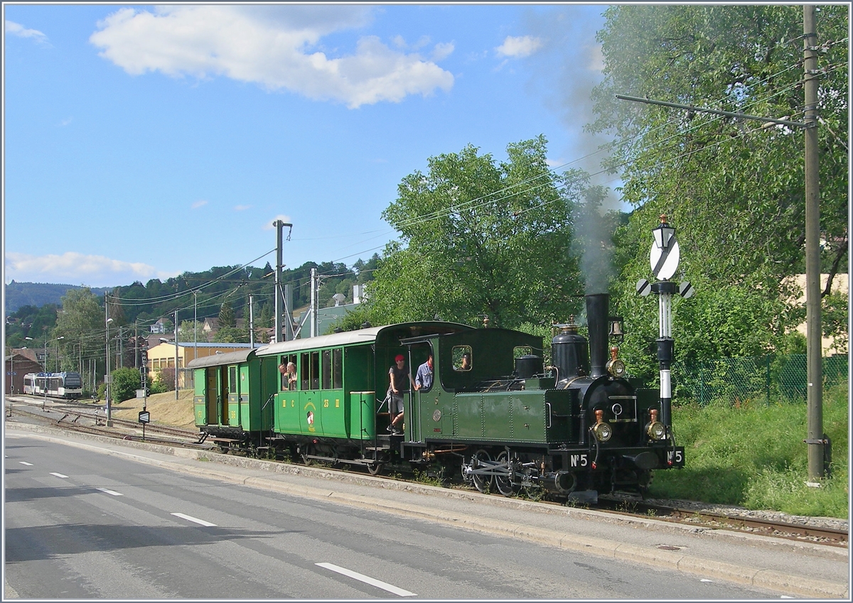 Die 1890 von der Société alsacienne de construction mécanique in Grafenstaden unter der Fabriknummer 4172 gebaute G 3/3 N° 5 verlässt mit einem passenden Zug Blonay in Richtung Chaulin.