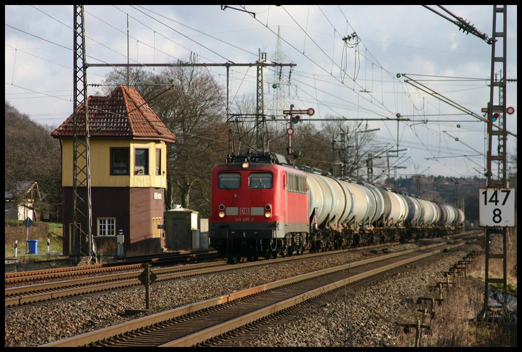 140495 passiert am 25.1.2005 mit einem Tank Wagen Zug in Richtung Rheine das alte westliche Stellwerk in Westerkappeln Velpe.
