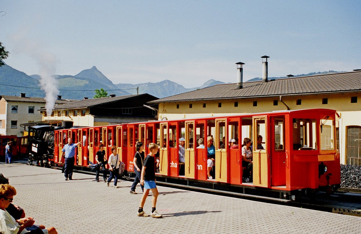 21.07.2002, Österreich, St.Wolfgang, Schafbergbahn, Lok ÖBB 999.204 mit mit zwei Vorsetzwagen in der Talstation. Bei diesem Anblick, kam mir der Begriff "Centoporte", den die Italiener für ihre vieltürigen Abteilwagen geprägt haben, in den Sinn.