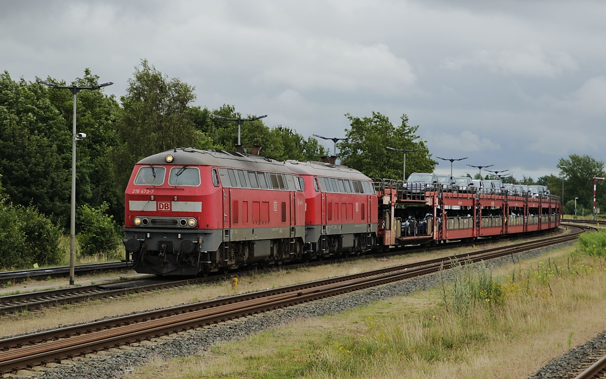 Am 05.07.2019 bespannten 218 473-7 und eine weitere 218 den Autoshuttle nach Sylt, hier vor der Abfahrt in Niebüll