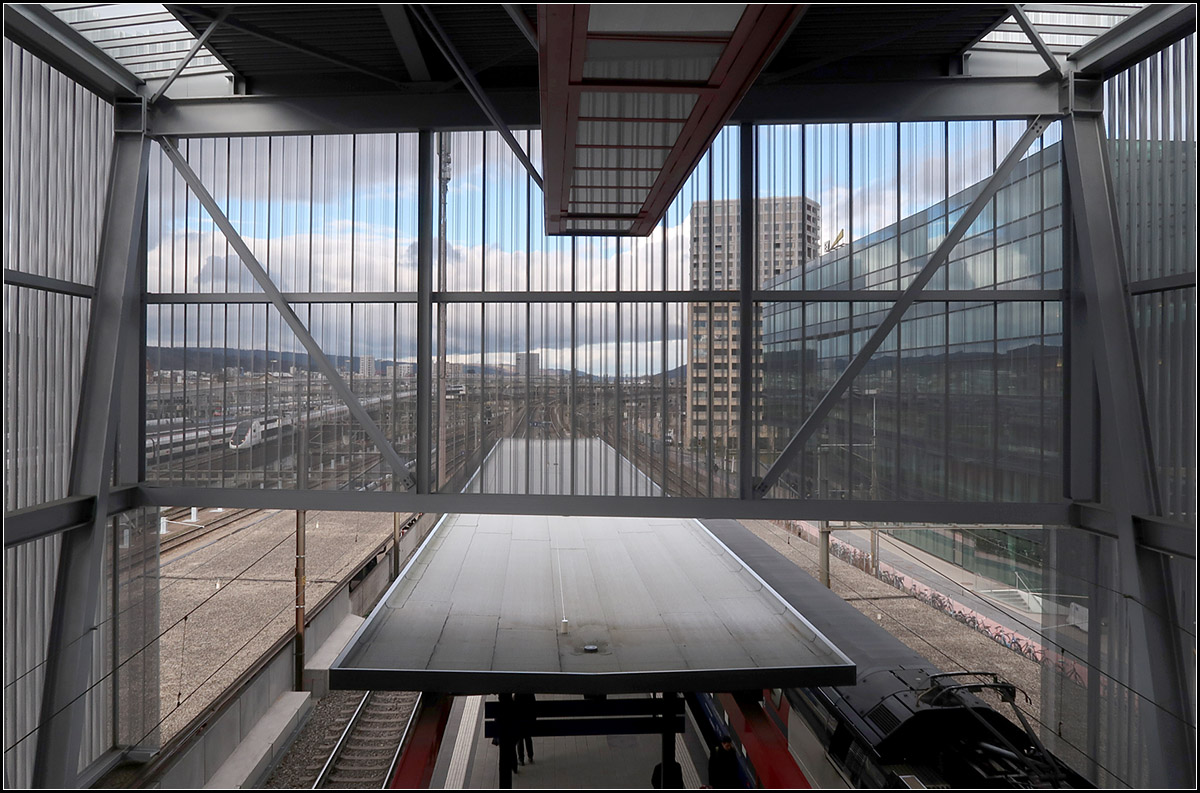 Abgang zum Mittelbahnsteig des Bahnhofes Zürich-Hardbrücke, Blickrichtung Westen mit erkennbarem TGV im Hintergrund.