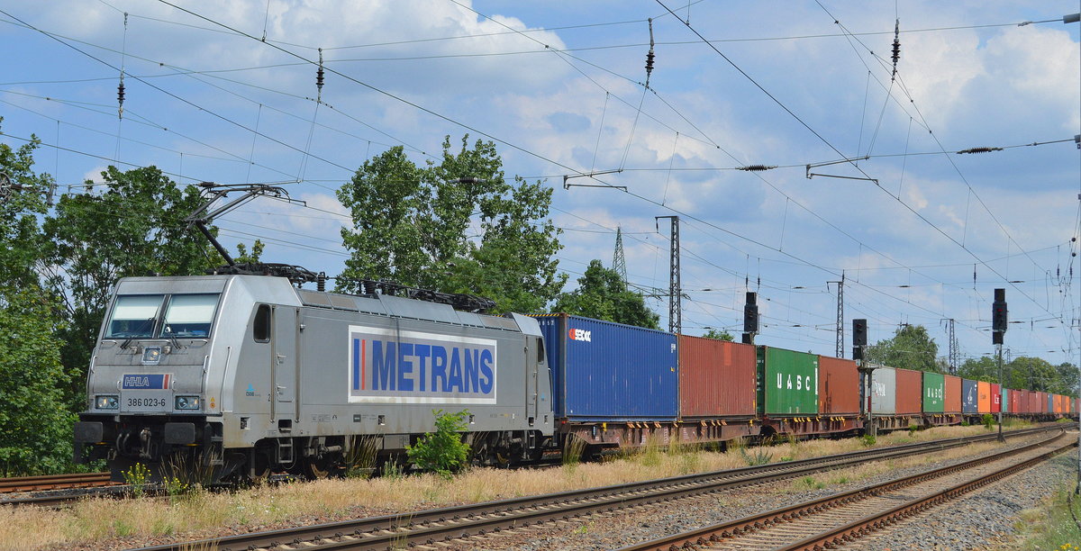 METRANS Rail s.r.o. mit "386 023-6" [NVR-Nummer: 91 54 7386 023-6 CZ-MT] und Containerzug am 22.06.19 in Saarmund.