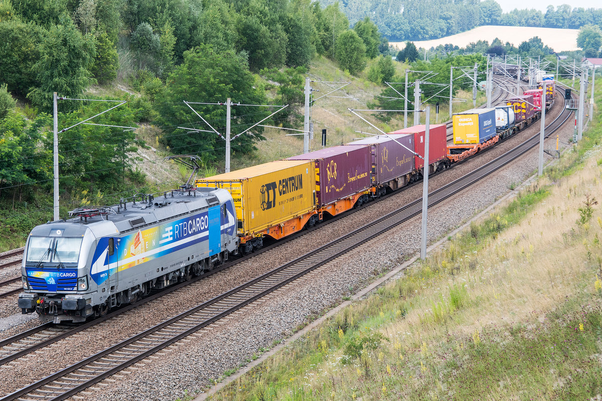 386 006 der Metrans passiert mit einem Containerzug Richtung Usti nad Labem am 14.06.19 den Bahnhof Decin.