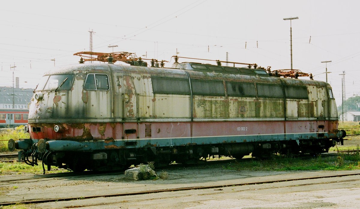 02.09.2005 Bw Lichtenfels: Lok 103 002 in desolatem Zustand. Zunächst hatte sie einen Platz in "Helmuts Spatzenpark" in Herrnried (Helmut Brossmann) gefunden. Wie ich gesehen habe, wird sie heute (17.07.2019) immer noch auf e-bay für 149 999,99 € zum Sofort-Kauf angeboten. Da sieht sie aber sehr viel besser aus. Ich habe leider einen sehr kleinen Keller.