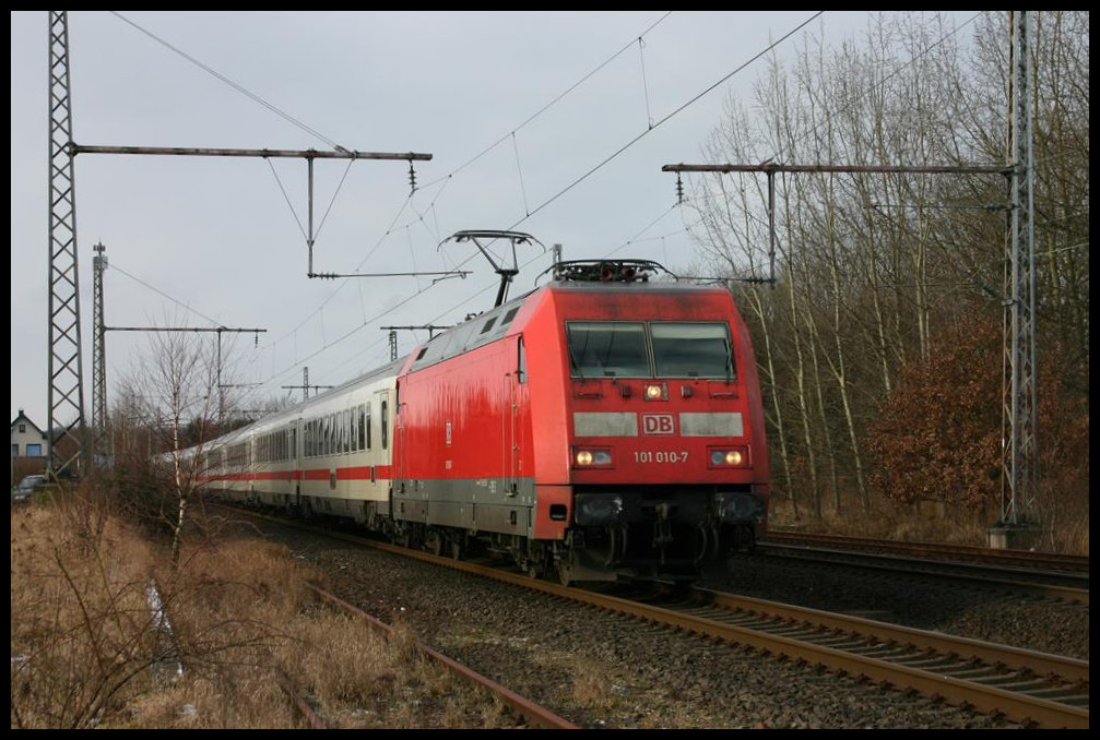 101010-7 durchfährt hier am 25.1.2005 den aufgelassenen ehemaligen Bahnhof Velpe bei Westerkappeln. Die Lok ist mit einem Intercity aus den Niederlanden nach Berlin unterwegs.