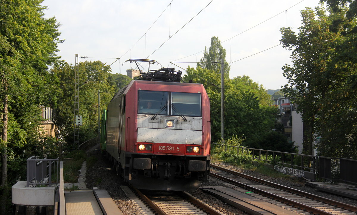 185 591-5 von der Rurtalbahn kommt aus Richtung Aachen-West mit einem Autozug aus Zeebrugge(B) nach Passau(D) und fährt durch Aachen-Schanz in Richtung Aachen-Hbf,Aachen-Rothe-Erde,Stolberg-Hbf(Rheinland)Eschweiler-Hbf,Langerwehe,Düren,Merzenich,Buir,Horrem,Kerpen-Köln-Ehrenfeld,Köln-West,Köln-Süd. Aufgenommen vom Bahnsteig von Aachen-Schanz.