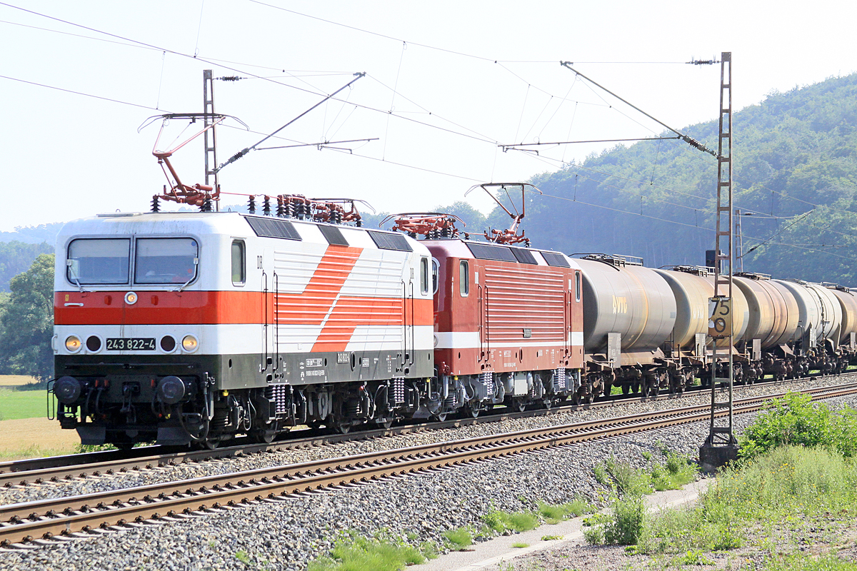 243 822-4 u. 243936-2 am 18.07.2019 nördlich von Salzderhelden mit Kesselwagen am Bü75,1 in Richtung Göttingen