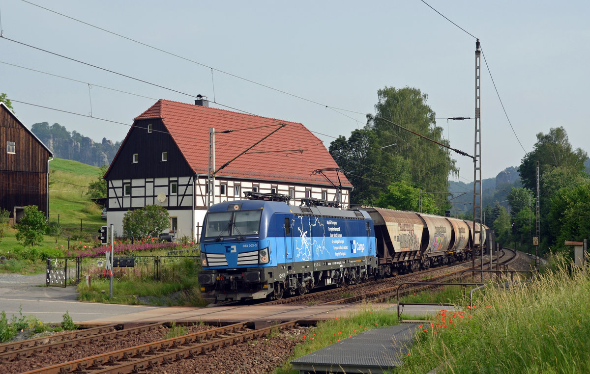383 002 schleppte am Morgen des 15.06.19 einen Transcereal durch Strand Richtung Bad Schandau.