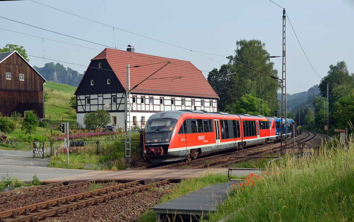 642 035 und 642 037 waren am Morgen des 15.06.19 von Dresden kommend auf dem Weg als RE nach Litomerice mesto. Hier passieren beide Desiros den BÜ in Strand.