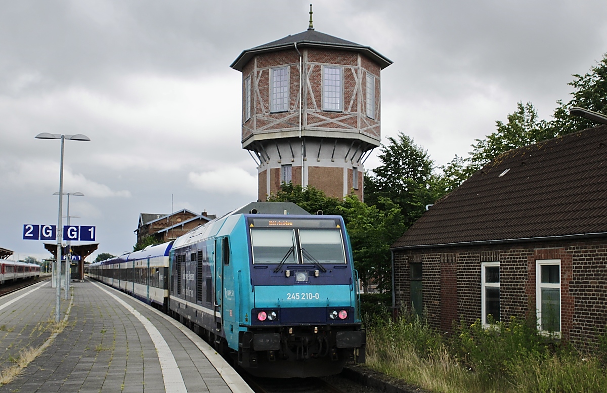 Am 05.07.2019 schiebt 245 210-0 einen RE aus Westerland in den Bahnhof von Niebüll. Im hohen Norden scheint man eine Vorliebe dafür zu haben, höhere Gebäude zu Hotels umzubauen, denn wie der Dagebüller Leuchtturm ist auch der frühere Wasserturm in Niebüll heute ein Hotel für zwei Personen.