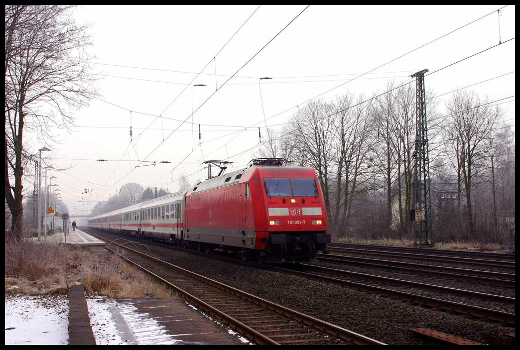 Auf dem Hauptgleis in Richtung Minden fahrend passiert hier die 101091-7 am 29.01.2005 mit einem Intercity den Haltepunkt Hiddenhausen Schweicheln.
