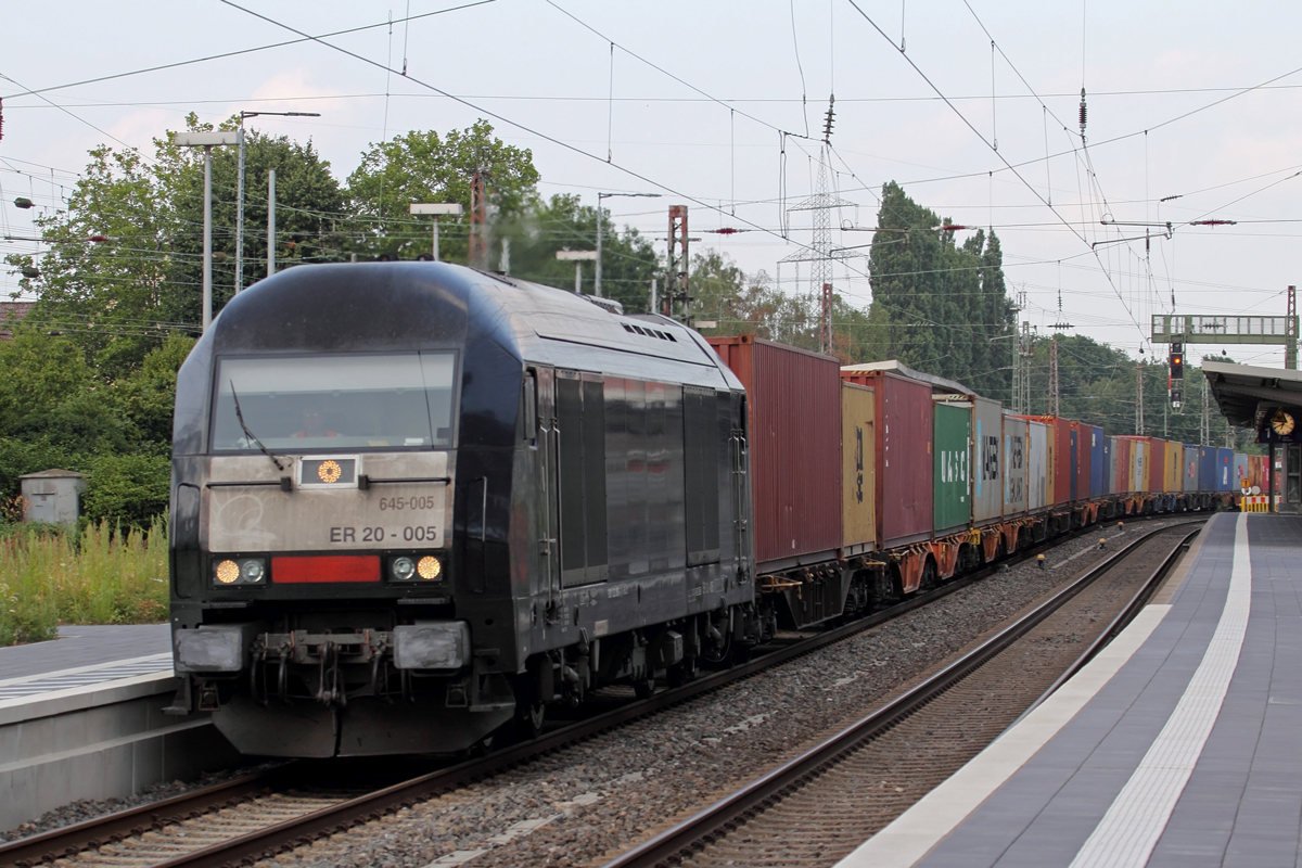 Mit einem Containerzug am Haken ist am Abend des 16.7.2019 die MRCE 189 097 für Boxxpress gen die Niederlande fahrend bei Gubberath unweit des Bü Fürther Hecke zu sehen.