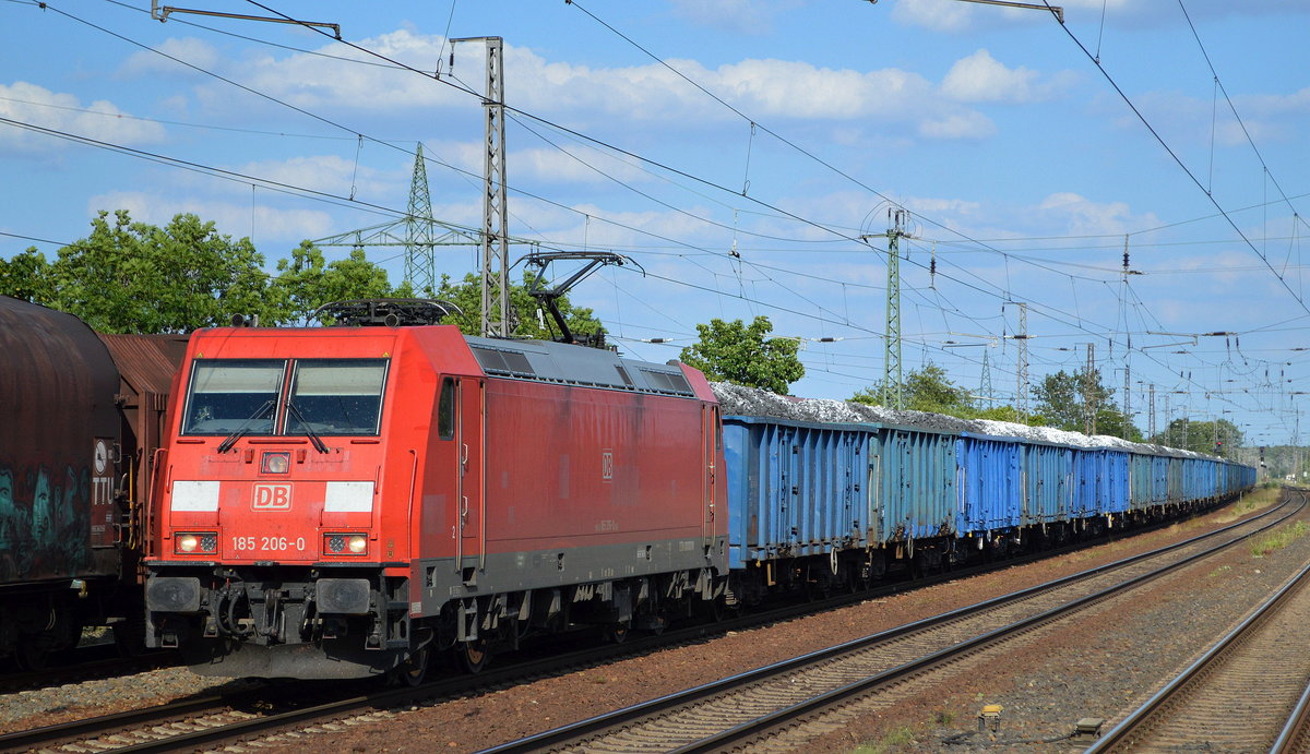 DB Cargo Deutschland AG mit "185 206-0" [NVR-Nummer: 91 80 6185 206-0 D-DB] und einem Ganzzug polnischer offener Güterwagen mit Kohle beladen am 01.07.19 Saarmund Bahnhof.
