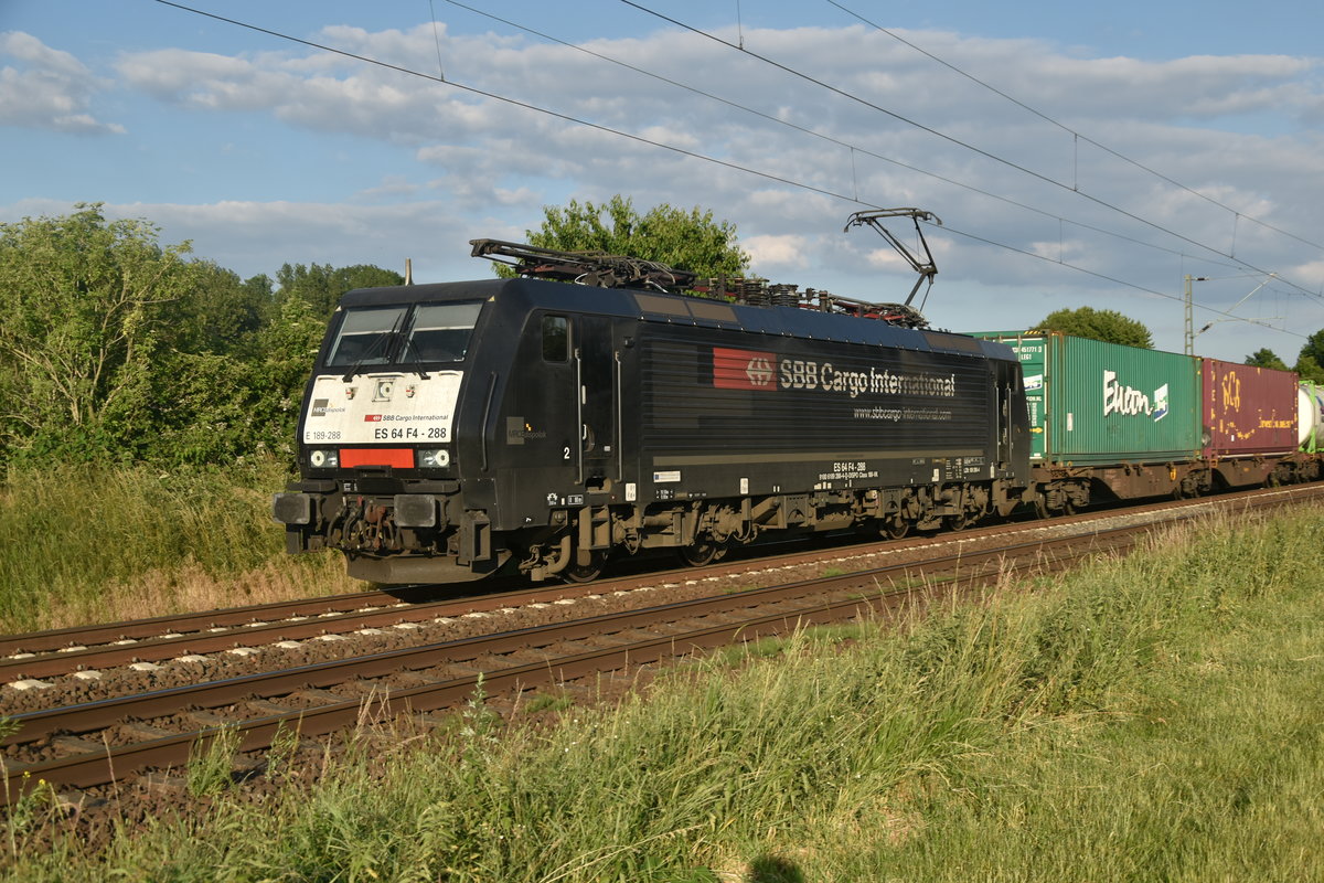 Die von der SBB Cargo geleaste MRCE 189 288 ist mit einem Containerzug bei Kaarst Broicherseite gen Osterath fahrend zu sehen. 17.6.2019