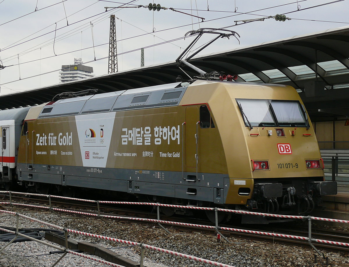101 071 "Zeit für Gold" als EC 219 von Frankfurt HBF nach Graz HBF am 8.7. um 15:02 Uhr im Ulmer HBF.