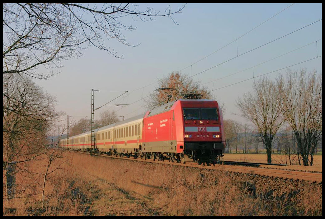 101119 mit Preis Werbung der DB erreicht hier am 6.2.2005 morgens mit ihrem IC aus Münster kommend den Ortsrand von Hasberge.
