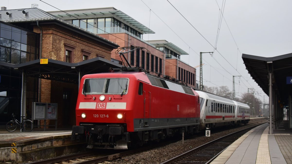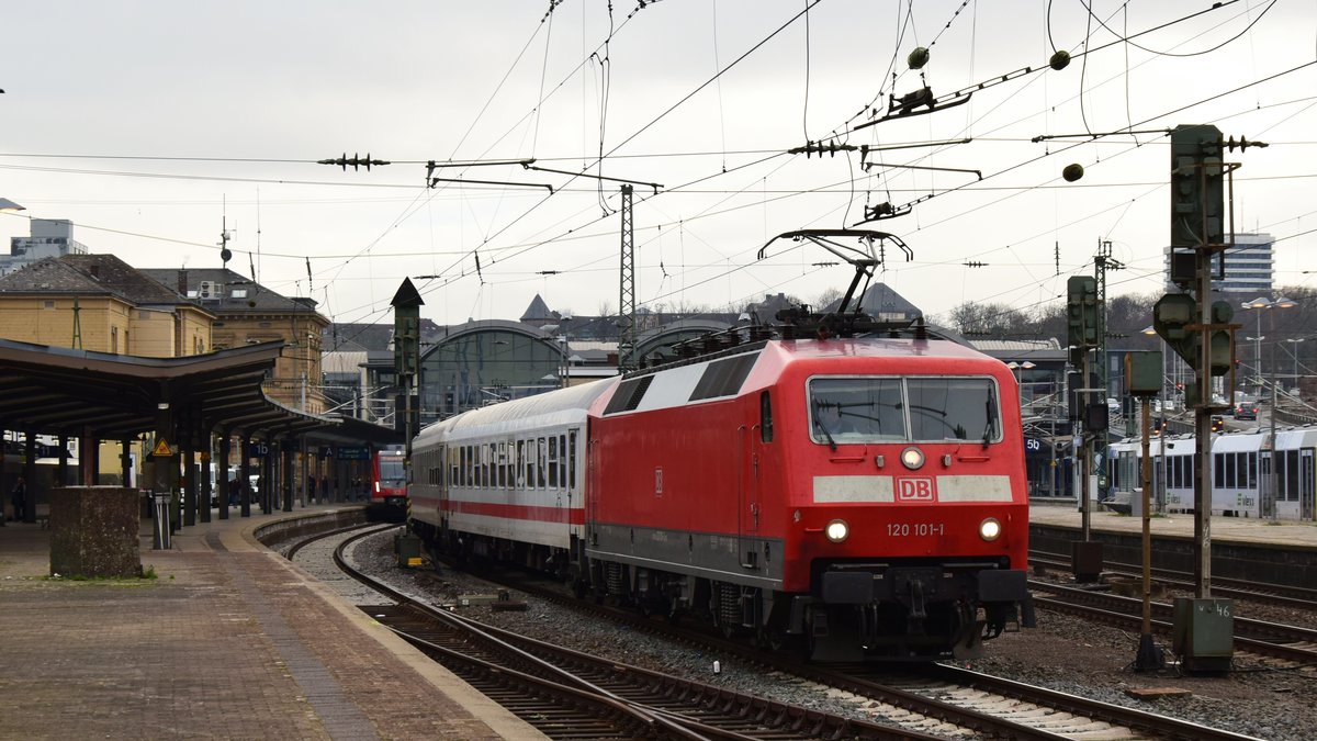 120 101 verlässt mit dem IC 2026 am Haken den Mainzer Hauptbahnhof. Aufgenommen am 5.2.2019 14:27