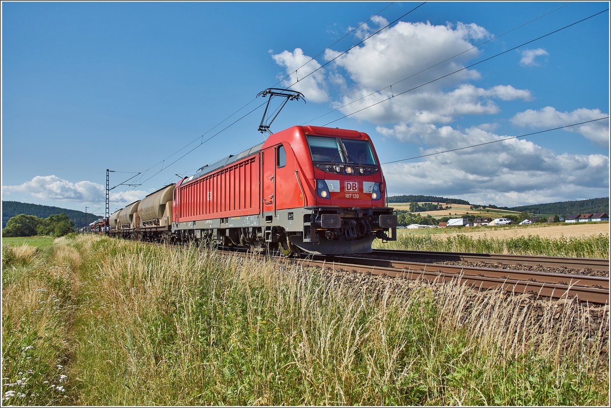 187 139 mit einer weiteren BR 187 (kalt), einer BR 155 (kalt) und einem Güterzug auf den südlichen Berliner Außenring bei Diedersdorf am 26. Mai 2019.
