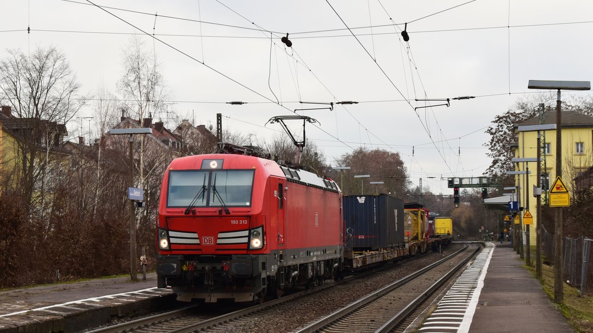 193 313 zieht einen KLV-Zug gen Koblenz durch Wiesbaden Biebrich. Aufgenommen am 5.2.2019 15:25