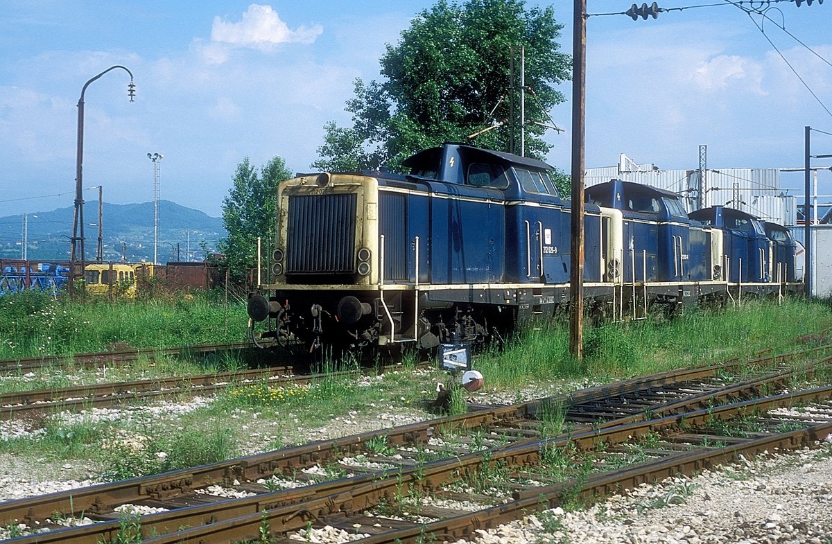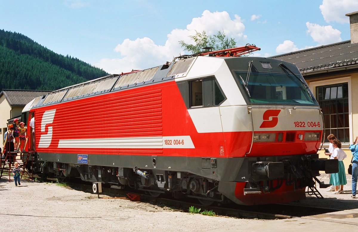 30.05.1993, Dampflokfest in Selzthal, ausgestellt ist auch die Zweisystem-E-Lok 1822 004-6 der ÖBB, vorgesehen für die Beförderung von Güterzügen über den Brenner in das italienische Gleichstromnetz. Die als Brennerlok bekannten 1822 sollten in Mehrfachtraktion vor Zügen der Rollenden Landstraße eingesetzt werden, um das Transitproblem über den Brennerpass in den Griff zu bekommen. Ihr hauptsächliches Einsatzgebiet waren aber die Korridorzüge nach Lienz, bis sie im September 2007 abgestellt wurden.