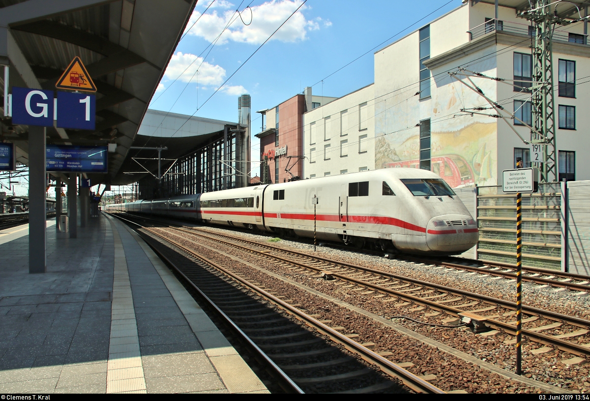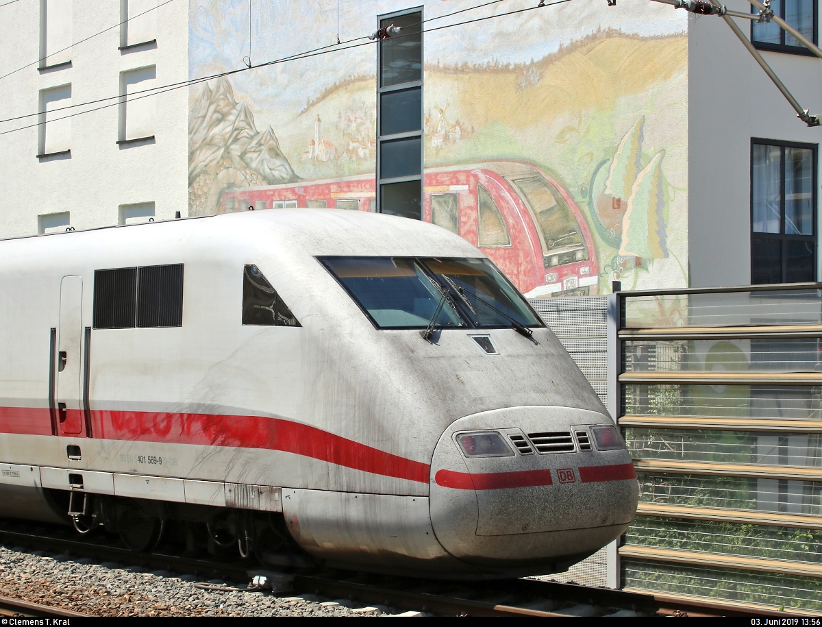 401 569-9 (Tz 169 "Worms") ist in Erfurt Hbf neben dem IntercityHotel, dessen Hauswand zum Bahnhof hin ein Bild eines DB-Zuges in bergiger Landschaft zeigt, vorübergehend abgestellt.