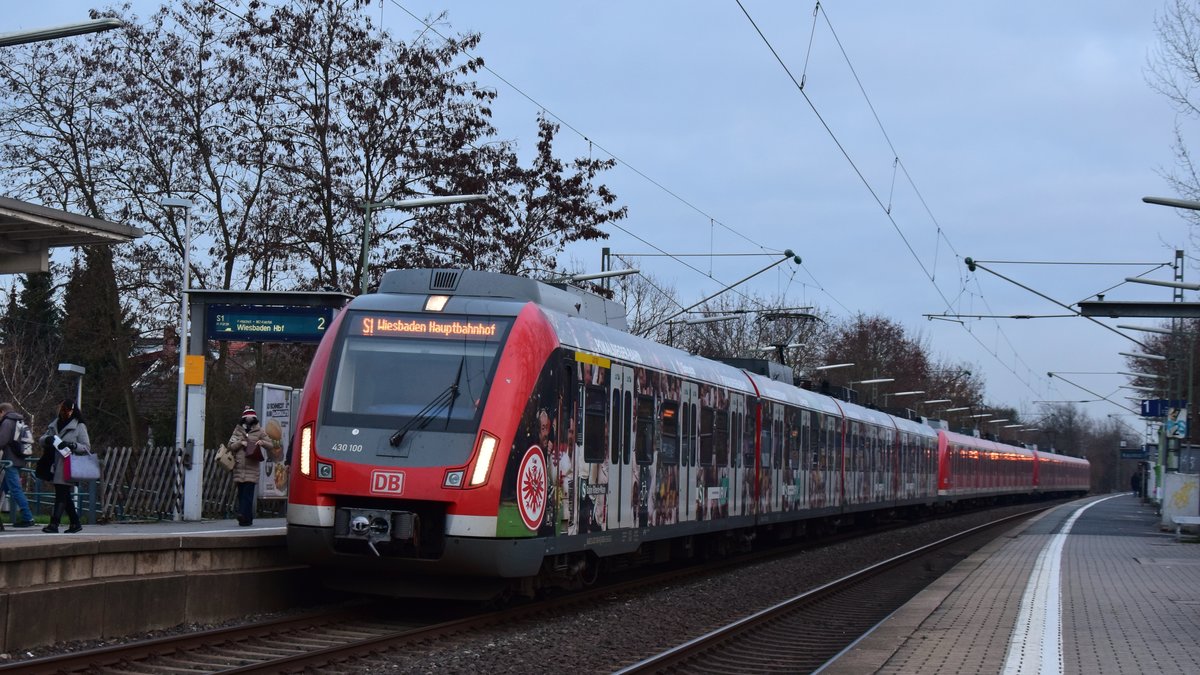 430 100 zusammen mit zwei weiteren 430ern auf dem Weg als S1 nach Wiesbaden Hbf beim Zwischenstopp in Frankfurt-Nied. Aufgenommen am 5.2.2019 17:18