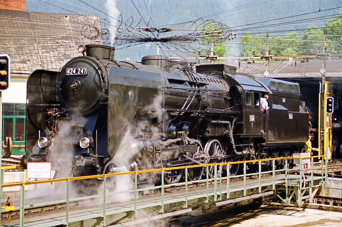 8.Juni 2003, Österreich, Selzthal. Dampflokfest, auf der Drehscheibe präsentiert sich Lok 424.247 der ungarischen MAV . Die Lokomotiven dieses Typs wurden seit 1924 gebaut. Die hier in vorzüglichem Zustand gezeigte dürfte allerdings erst in den 50er Jahren die Werkhallen der MAVAG in Budapest verlassen haben. Ihren Standort hat sie im Eisenbahnmuseum Budapest.