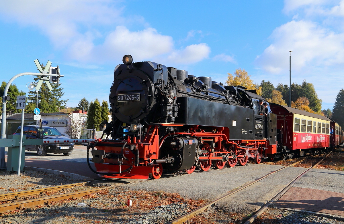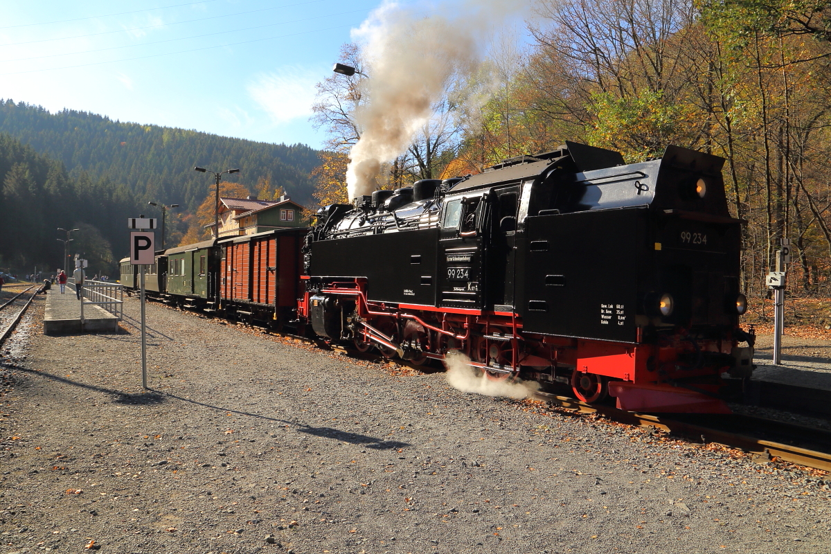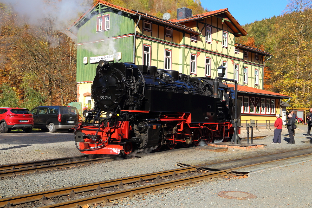 Gerade ist am Mittag des 20.10.2018 99 234 mit ihrem IG HSB-Sonder PmG aus Wernigerode im Bahnhof Eisfelder Talmühle eingelaufen. Hier wird nun gleich umgesetzt und Wasser genommen. Danach geht es weiter nach Stiege.