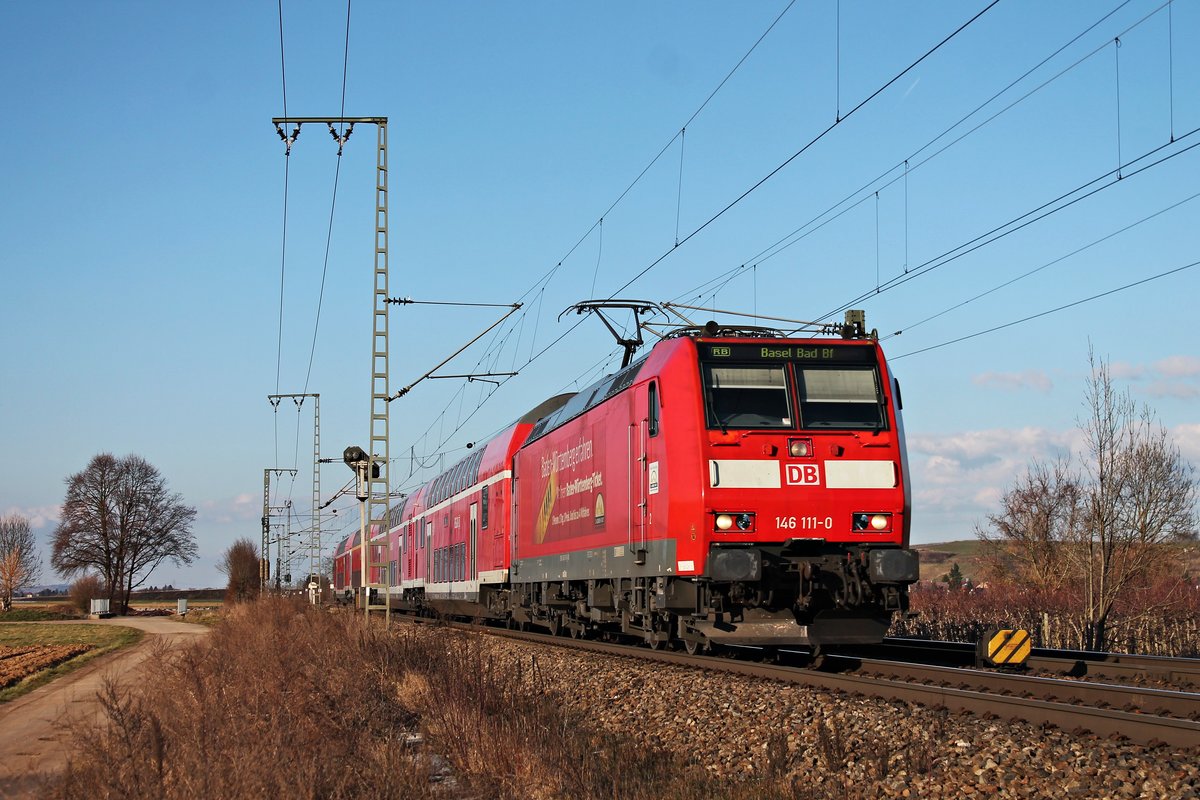 Am Nachmittag des 14.03.2018 fuhr 146 111-0 mit ihrer RB (Offenburg - Basel Bad Bf) nördlich von Müllheim (Baden), wo sie im gleichnamigen Bahnhof gleich ihren nächsten Zwischenhalt einlegen wird, durchs Rheintal in Richtung Schweiz.