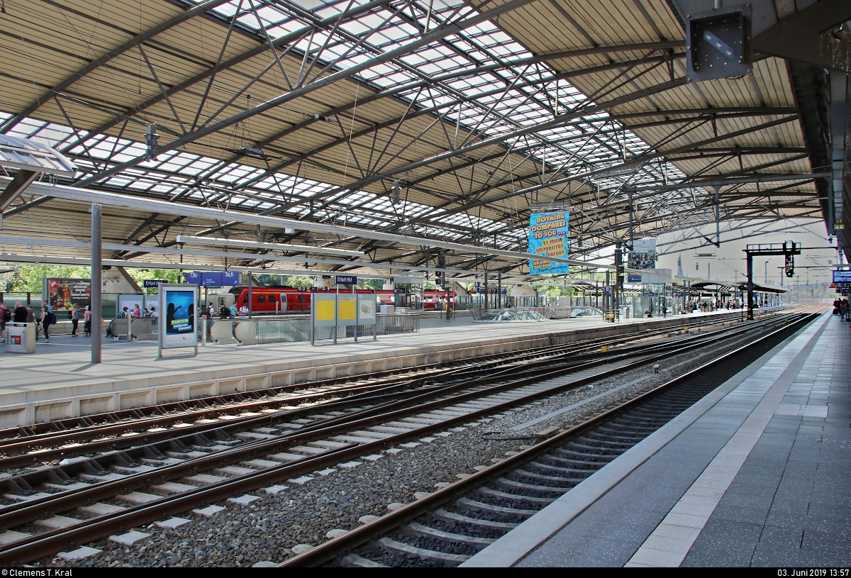 Blick in die große, moderne Bahnsteighalle in Erfurt Hbf von Gleis 2 bis 10.