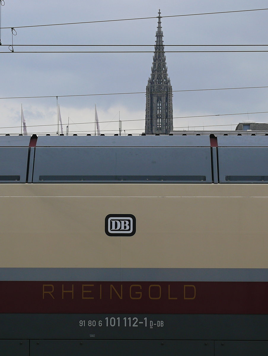 Die Seitenansicht der 101 112 "Rheingold" vor dem Turm des Ulmer Münsters.