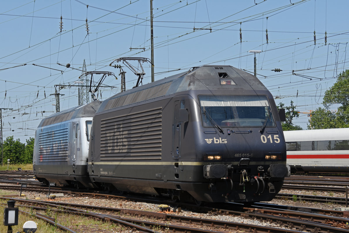 Doppeltraktion, mit den BLS Lok 465 015-6 und 465 016-4 wird in der Abstellanlage beim badischen Bahnhof abgestellt. Die Aufnahme stammt vom 04.07.2019.