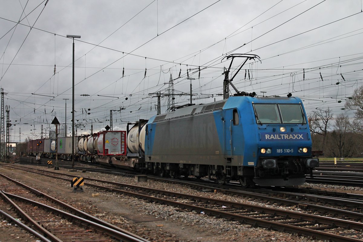 Durchfahrt am Nachmittag des 13.03.2018 von ATLU/RTX 185 510-5 mit ihrem Containerzug aus Belgien durchs nördliche Vorfeld vom Badischen Bahnhof von Basel in Richtung Rangierbahnhof Muttenz.