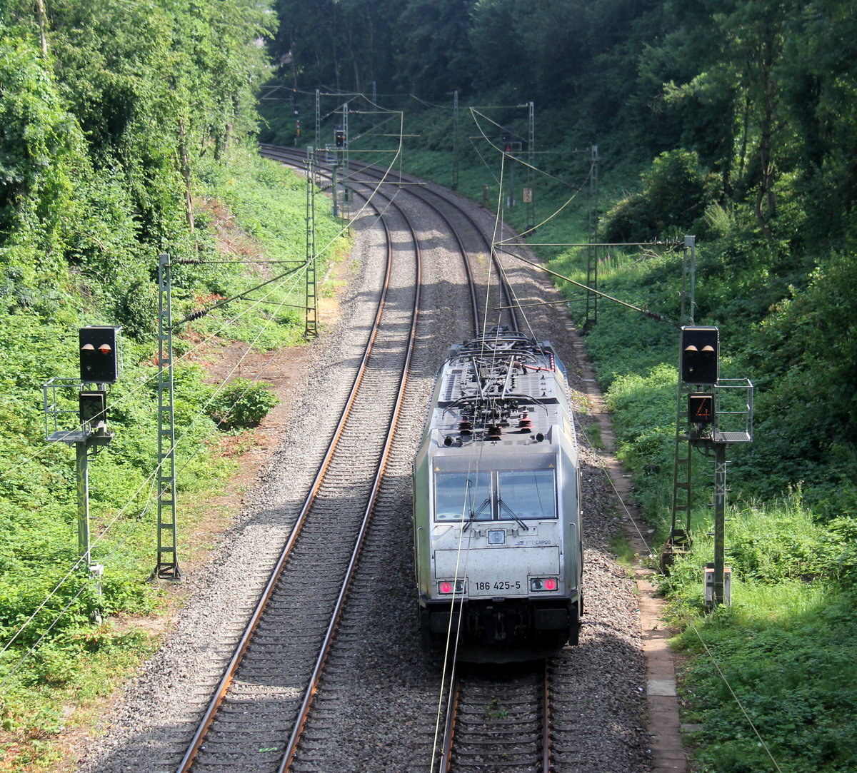 Ein Blick auf die 186 425-5 von der Rurtalbahn-Cargo sie fährt als Lokzug aus Aachen-West(D) nach Aachen-Hbf(D) und kommt aus Richtung Aachen-West und fuhr durch Aachen-Schanz in Richtung Aachen-Hbf.