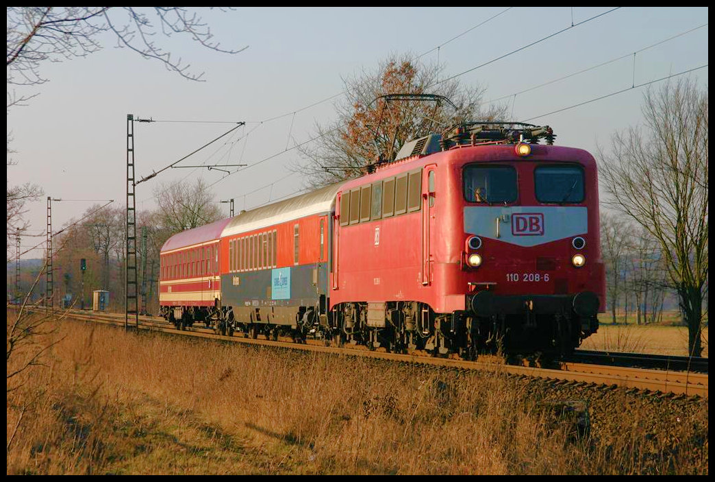Gegen Ende der Winter Ski Saison wird und wurde der Schnee Express immer kürzer. Am 8.2.2005 erreicht hier die 110208 mit inzwischen nur noch zwei Wagen aus Österreich kommend den Ortsrand von Hasbergen. Der Zug ist auf dem Weg nach Hamburg. Nächster Halt ist Osnabrück.
