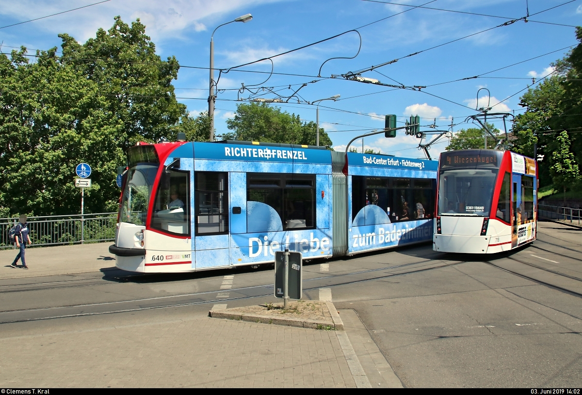 Siemens Combino Advanced, Wagen 640 mit Werbung für die Niederlassung der Richter+Frenzel GmbH + Co. KG in Erfurt, der Erfurter Verkehrsbetriebe AG (SWE EVAG) als Linie 4 von Wiesenhügel nach Bindersleben trifft auf Siemens Combino Classic, Wagen 722 mit Werbung für die Sparkasse Mittelthüringen und Wagen 718 mit Werbung für Partner der Erfurt-App, als Linie 4 in die Gegenrichtung an der Haltestelle Hauptbahnhof.