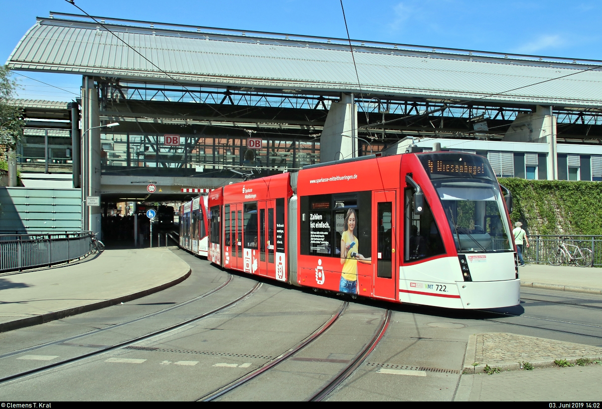 Siemens Combino Classic, Wagen 722 mit Werbung für die Sparkasse Mittelthüringen und Wagen 718 mit Werbung für Partner der Erfurt-App, der Erfurter Verkehrsbetriebe AG (SWE EVAG) als Linie 4 von Bindersleben nach Wiesenhügel verlassen die Haltestelle Hauptbahnhof.