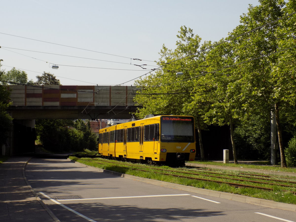 eine DT8.4 3033/3034 als U15 Richtung Ruhbank (Fernsehturm) verlässt denn Stadtteil Stammheim und fährt den Berg hinab in den Stadtteil Zuffenhausen. Hier zwischen denn Haltestellen Heutingsheimer Straße und Wimpfener Straße.
