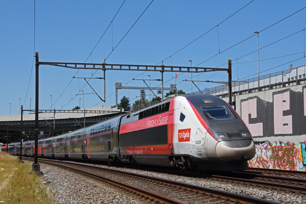 TGV Lyria 2723 fährt Richtung Bahnhof Muttenz. Die Aufnahme stammt vom 10.07.2019.