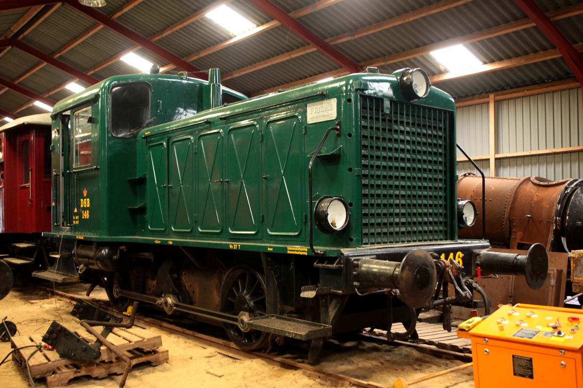 Traktor "Ardelt" DSB 146 (Frichs, Århus Bauj.: 1959, Fabr.-Nr.: 653) in der Fahrzeughalle in Bryrup am 30.05.2019. Diese Lok wurde in mehreren Dienststellen der DSB eingesetzt und 1986 an die HP (Hjørring Privatbaner / Hitshalsbanen) abgegen und dort als T12 bezeichnet. Seit 2002 ist sie bei der VBV und einsatzbereit.