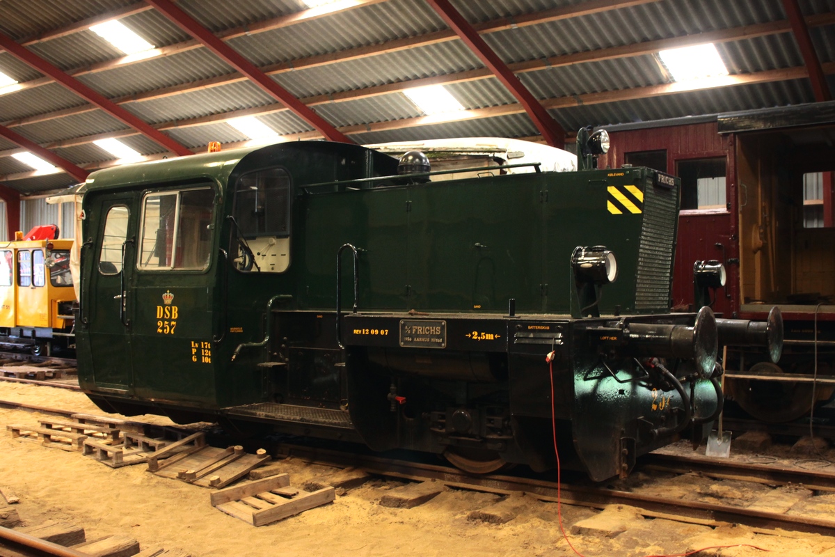 Traktor "Køf" DSB 257 (Frichs, Århus Bauj.: 1966. Fabr.-Nr.: 868) am 30.05.2019 in der Fahrzeughalle in Bryrup. Seit 2007 bei der VBV und einsatzbereit. Zuvor in mehreren Dienststellen der DSB und ab 2001 bei RDK (Railion Danmark) eingesetzt.