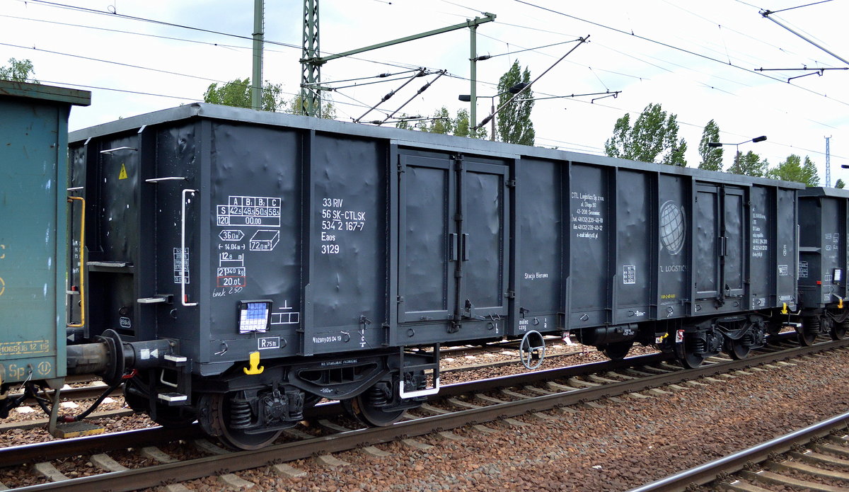 Vierachsiger, offener Güterwagen vom Einsteller CTL SLOVAKIA, s.r.o. mit der Nr. 33 RIV 56 SK-CTLSK 534 2 167-7 Eaos (3129) in einem Ganzzug offener Güterwagen am 05.07.19 Bahnhof Flughafen Berlin-Schönefeld.