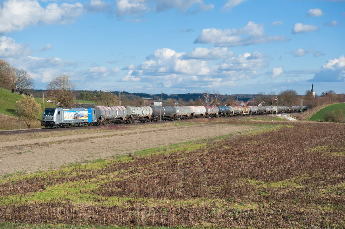 187 315 "Jim Knopf" der IGE mit einem Kesselwagenzug bei Fahlenbach Richtung Ingolstadt, 18.03.2019